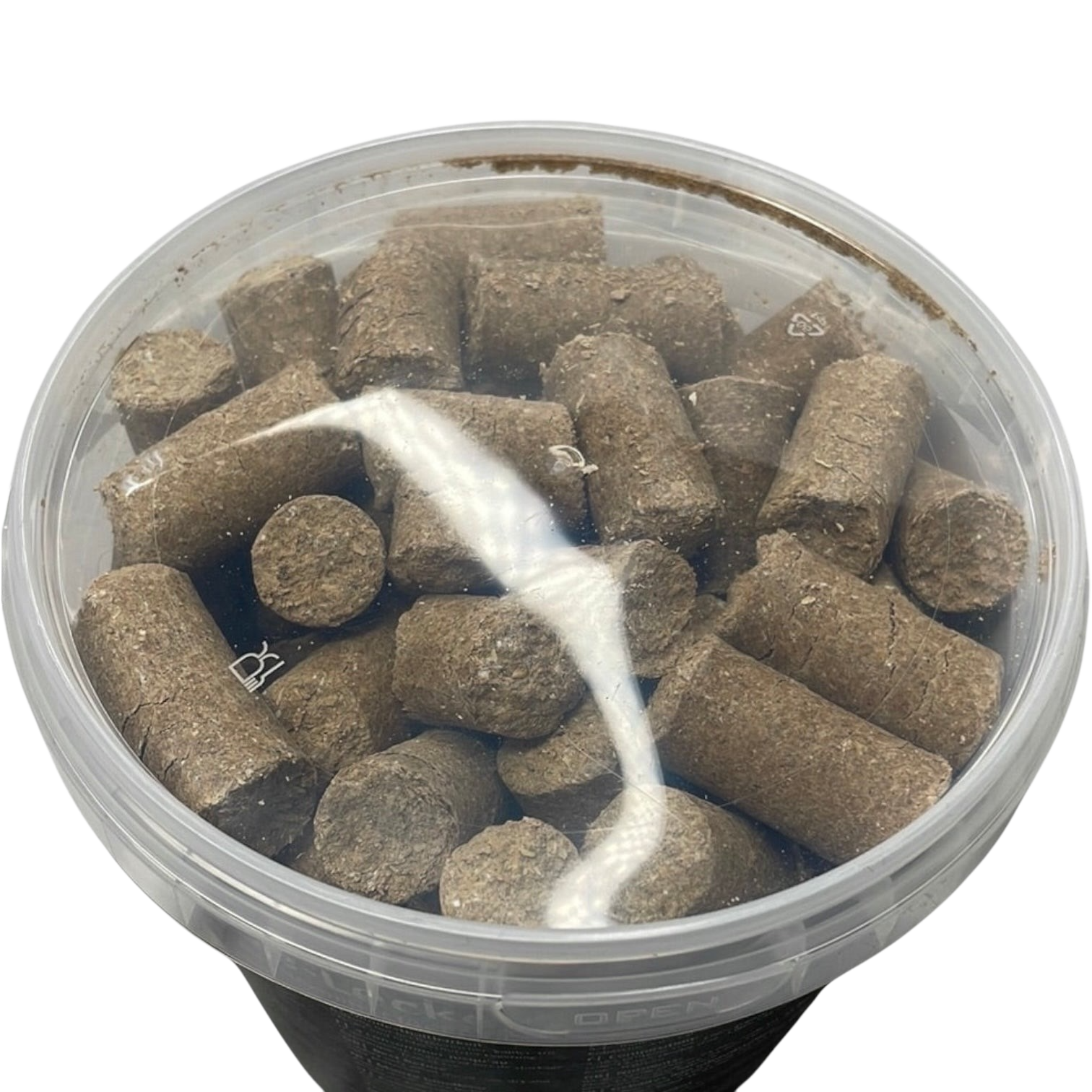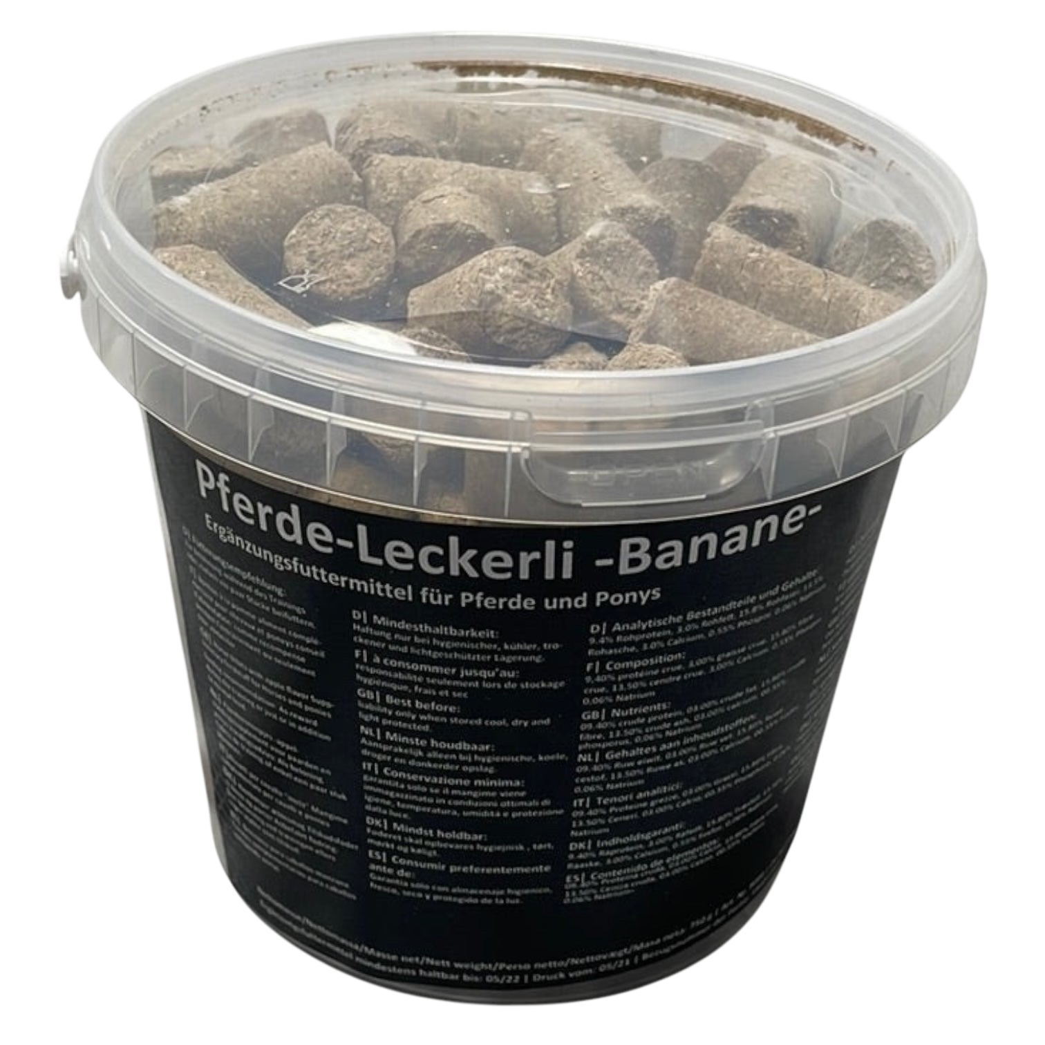 750g (1.65lb) bucket of banana flavored treats containing molasses, barley, wheat, dried banana, and a mix of vitamins A, D, and E.