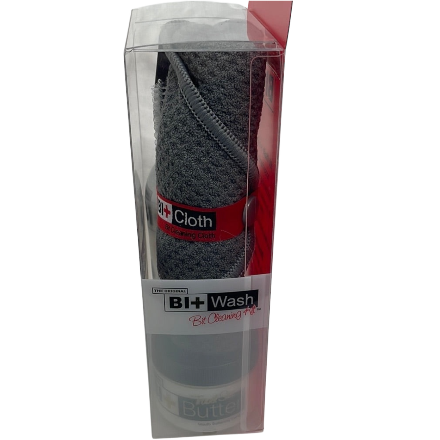 Keep your horse’s bit clean and fresh! Kit includes 6oz Bit+Wash, a microfiber Bit+Cloth with an attached hanging loop and a Bit Cleaning Wand that is perfect to clean the tighter jointed areas.