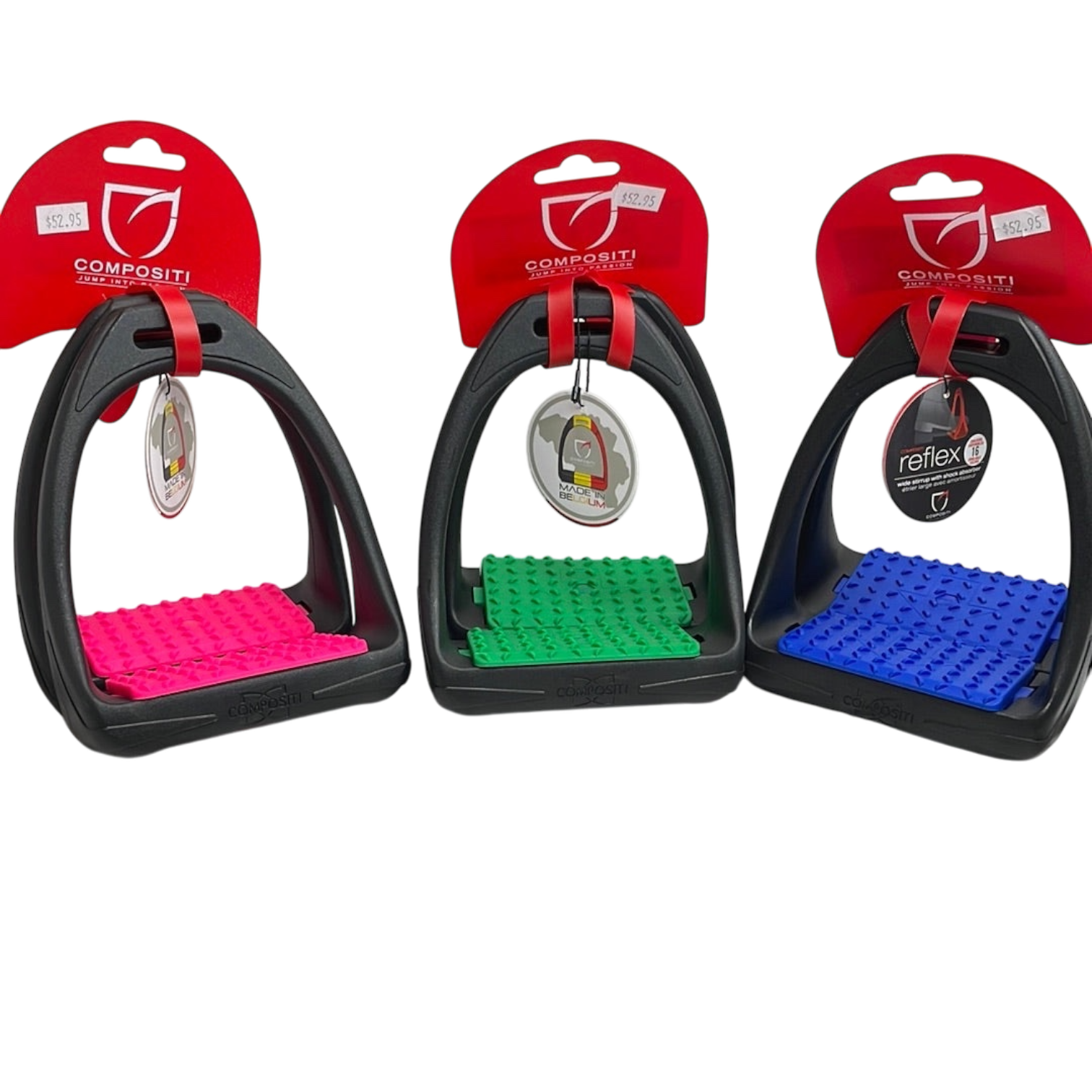Any rider that wants to relieve tension on knees and ankles needs to try these stirrups. Made of one of the strongest hi-tech polymers produced by DuPont®. The integrated 3D swivel action treads are positioned on a shock absorbent layer to relive tension on knees and ankles. The wide tread provides a more secure and comfort foundation.
