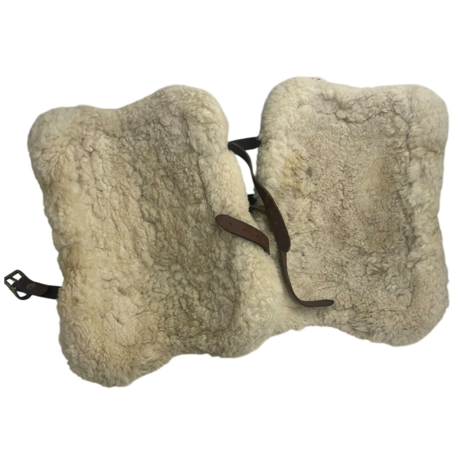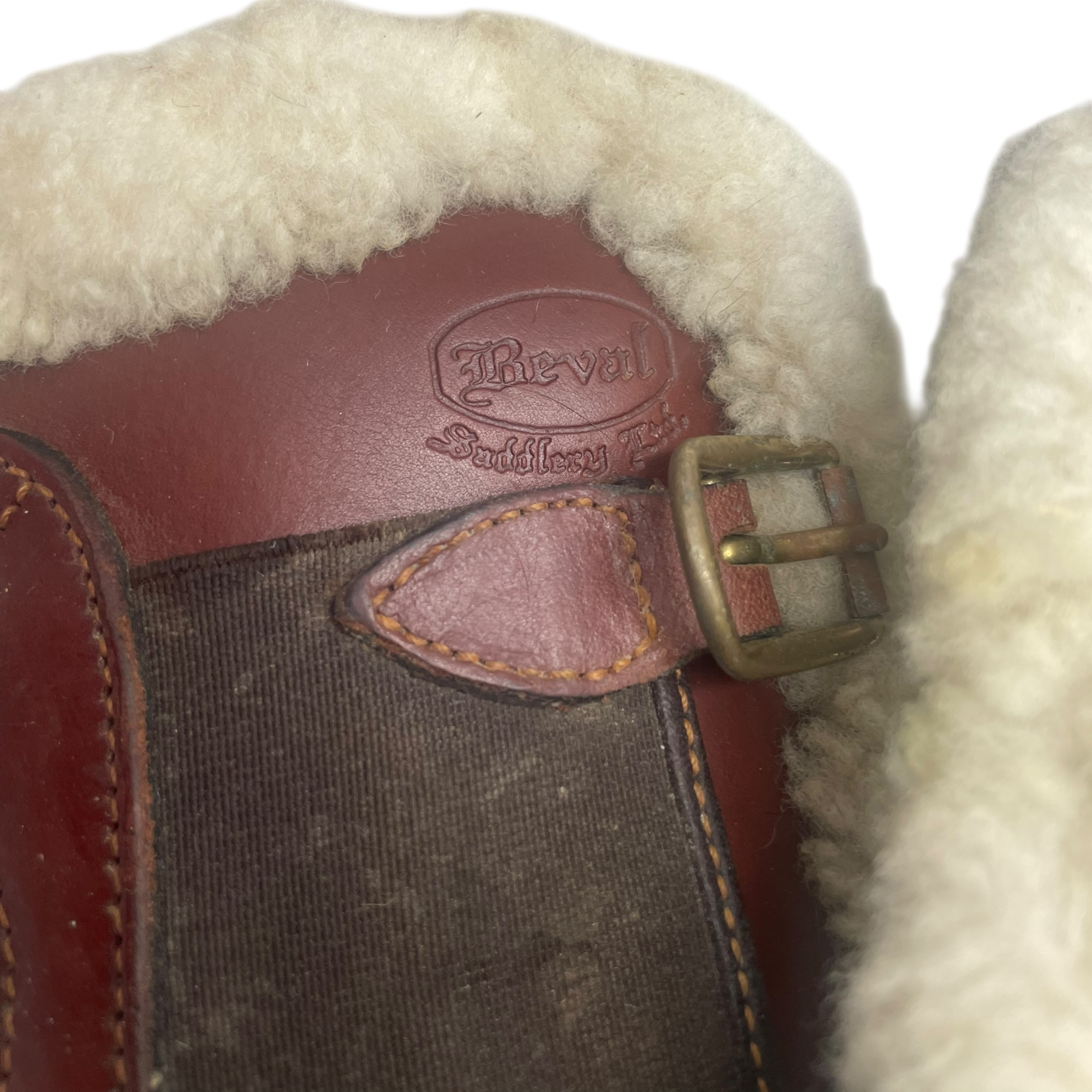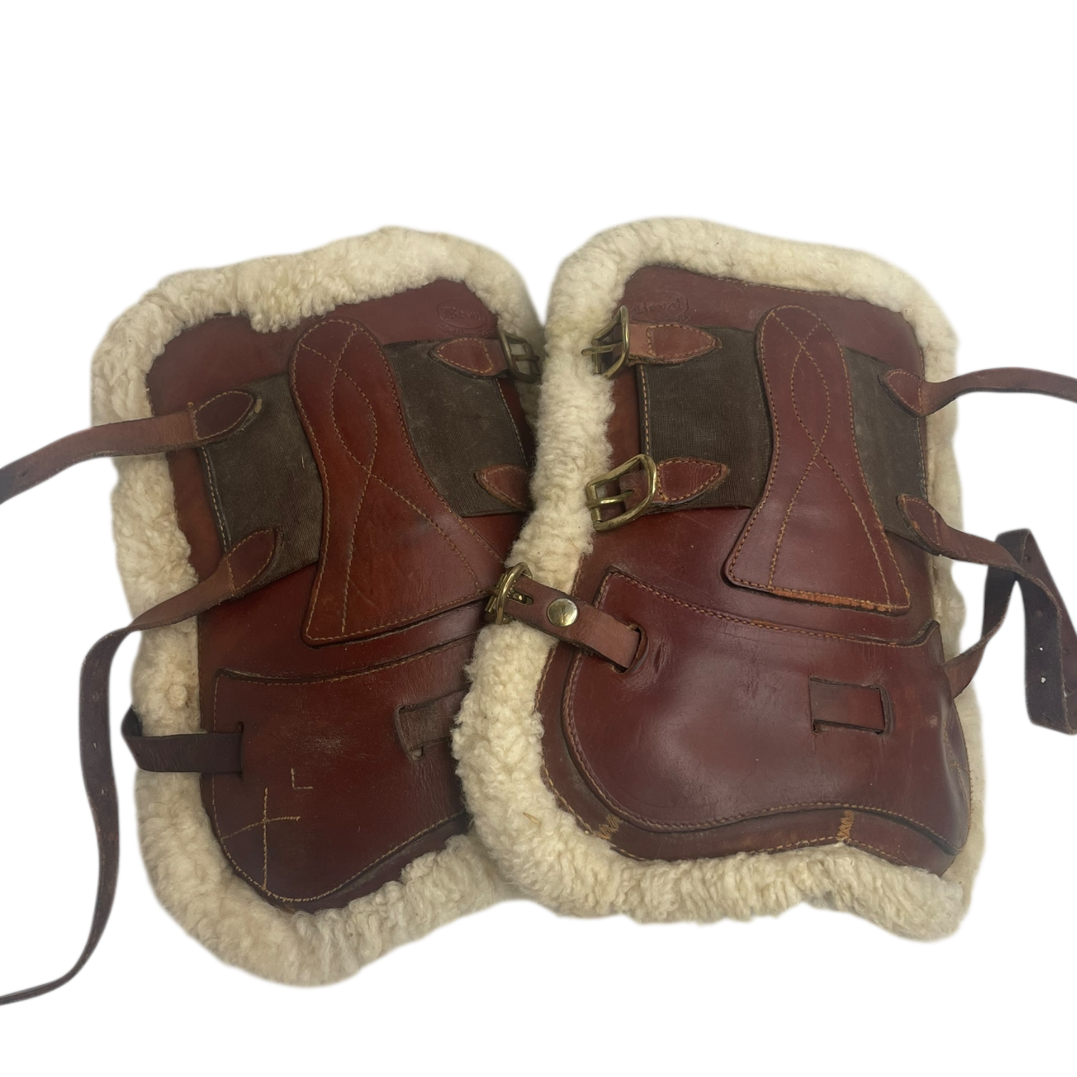 Beval Sheepskin Open Front Boots. Size not labeled, appears full sized. Fronts only. Oakbark brown with 3 leather strap closure and brass hardware. Some signs of wear, sheepskin still in great condition.