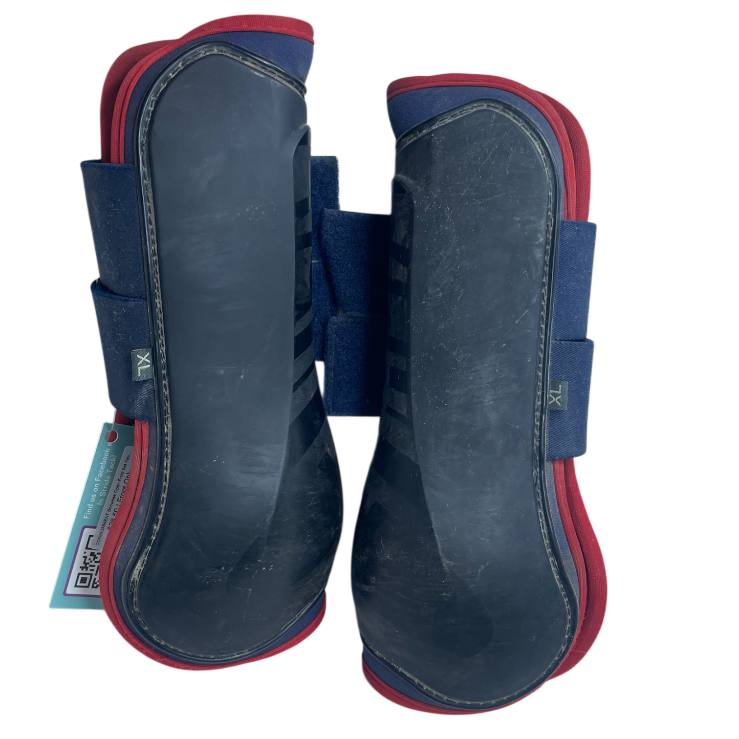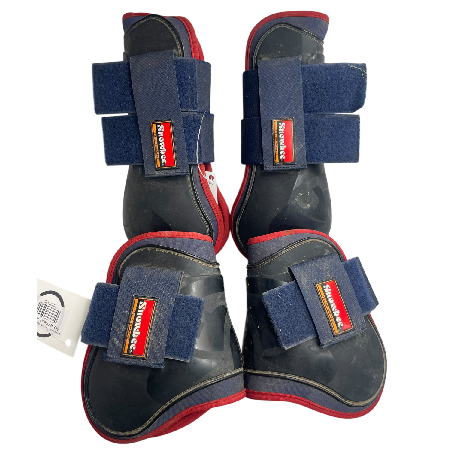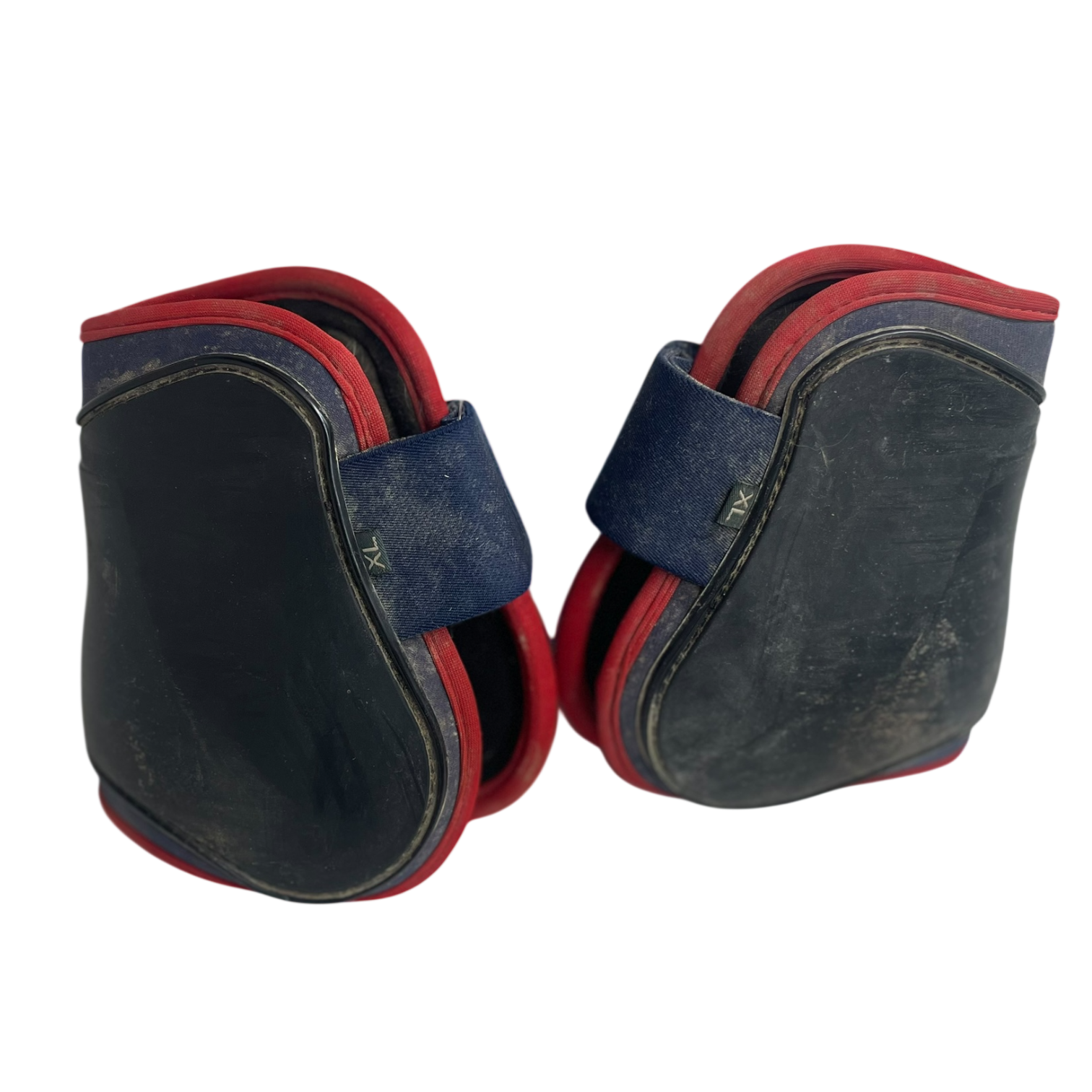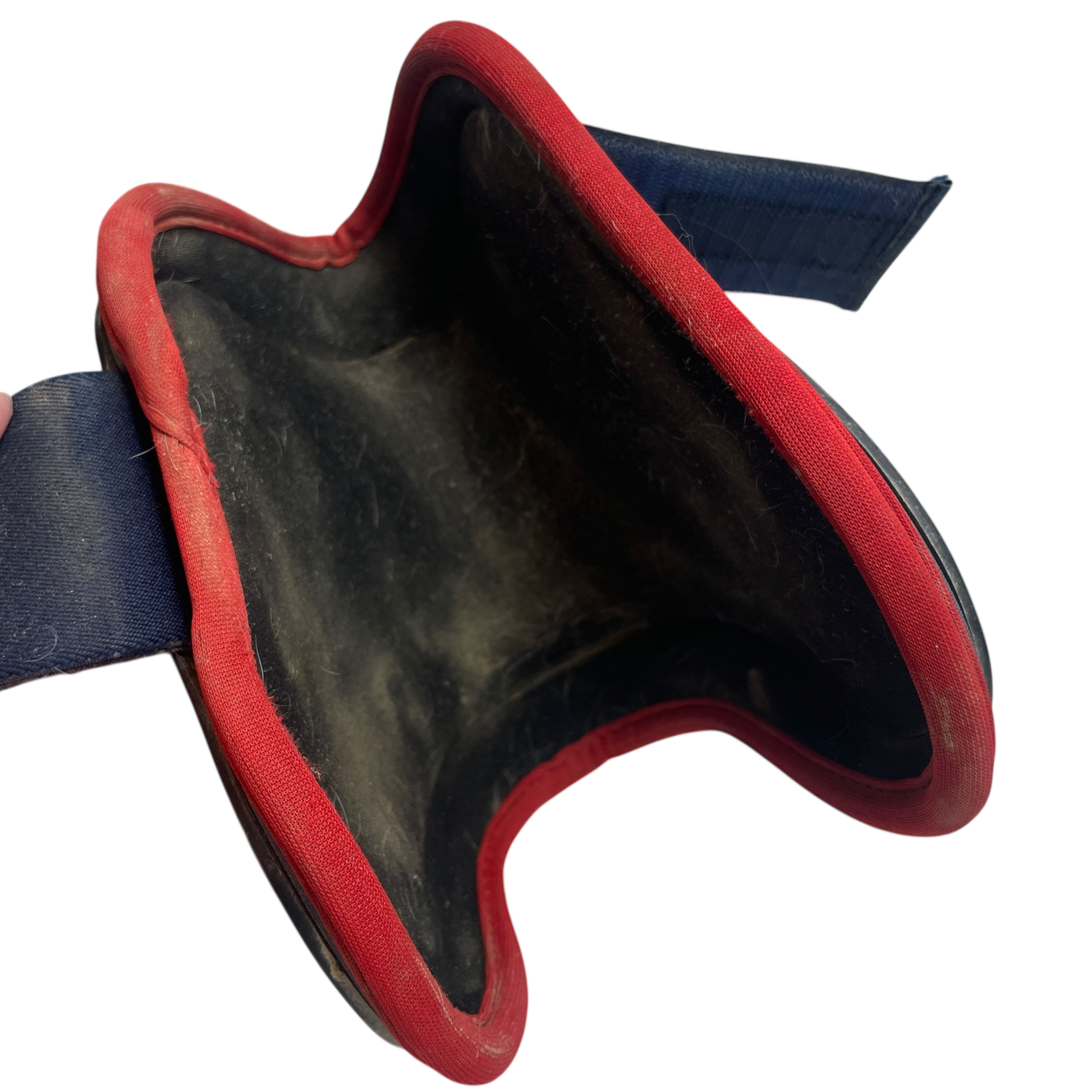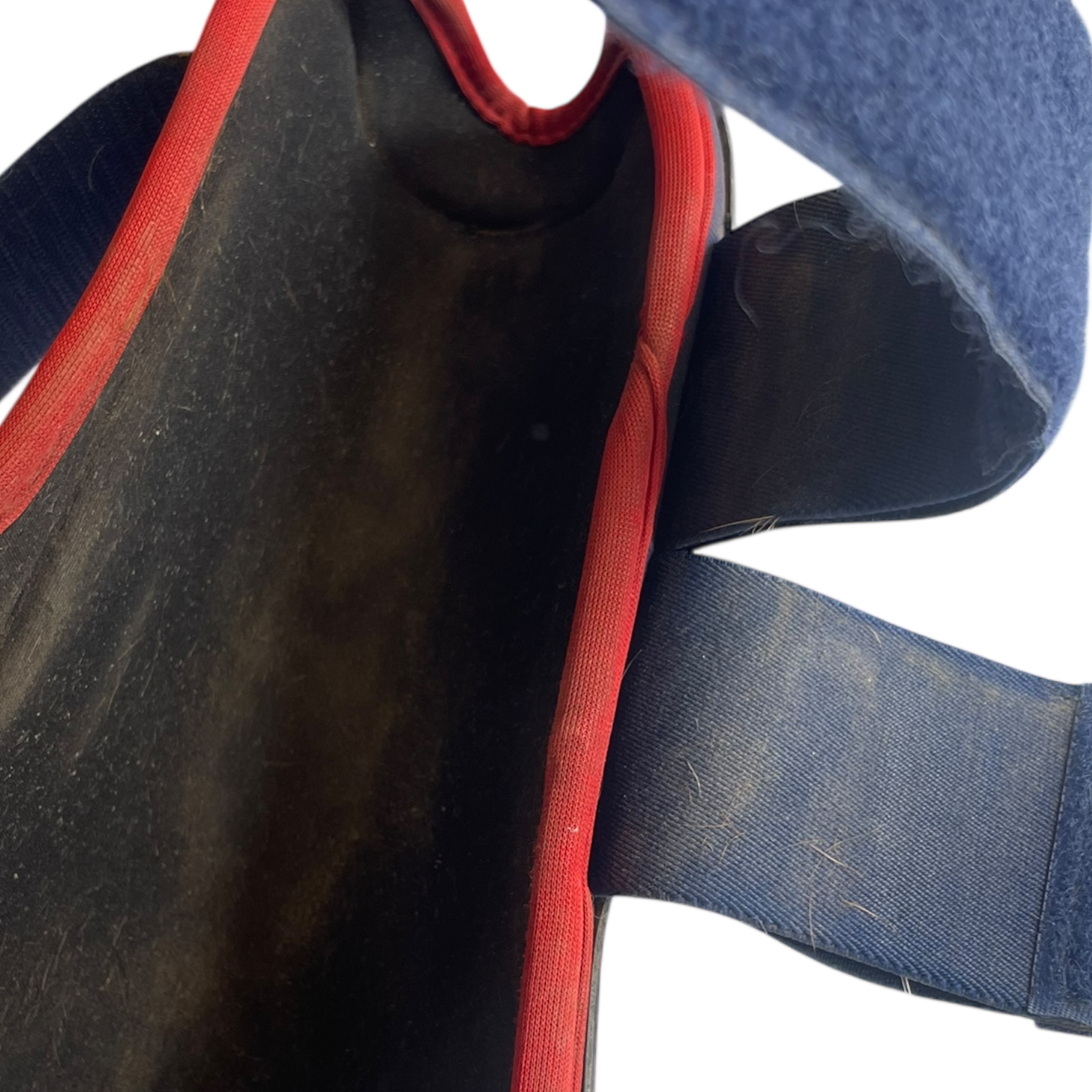 CONSIGNMENT Snowbee Hard shell open front boots set of front and hind. Navy with red, double velcro and top closing velcro. Heavy use, with signs of dirt but no loss of integrity to the shell or padding of the boots. Set of 2 front boots and set of 2 hind boots. Can buy set or just fronts or hind.