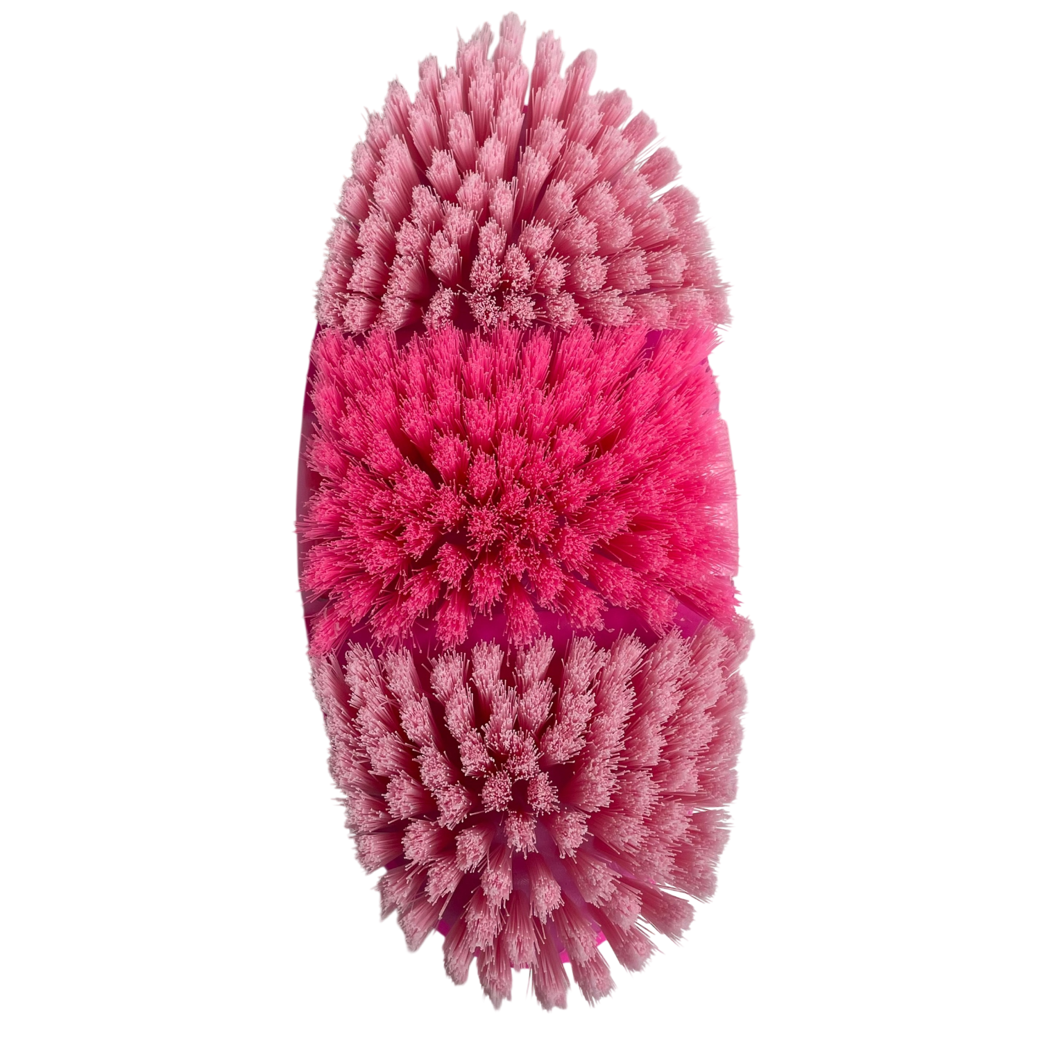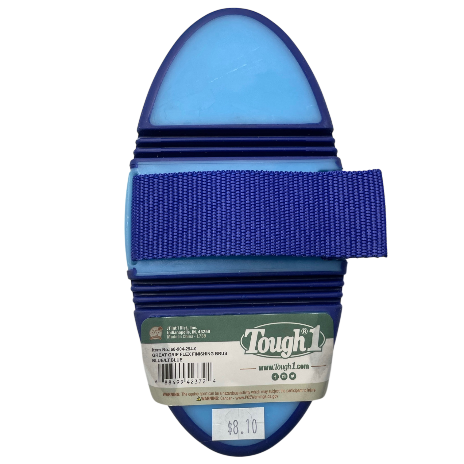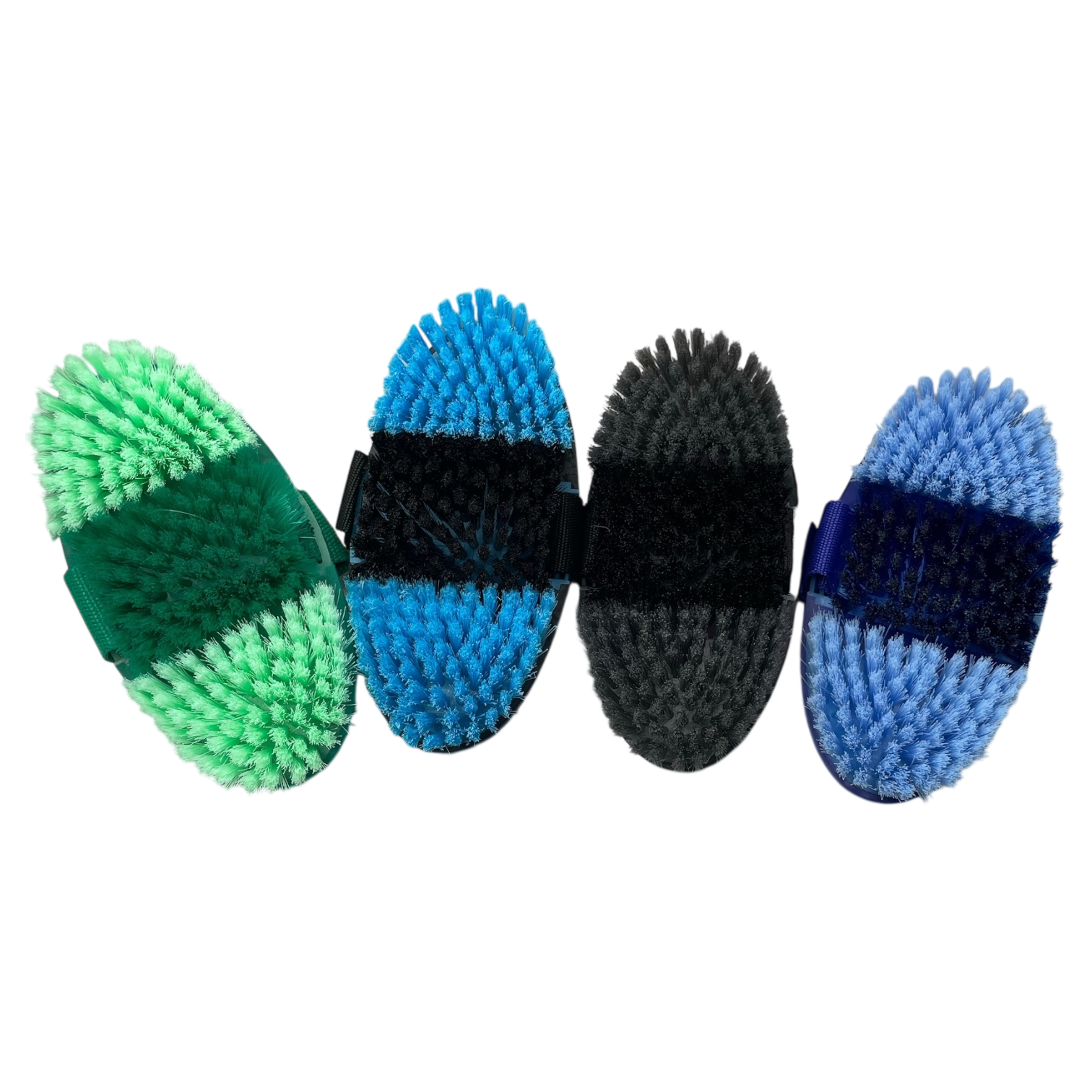 The adjustable hand strap keeps the brush firmly and comfortably in your hand. This brush flexes at two points, allowing the brush to fit the contours of the horses body. This is the perfect brush for legs!