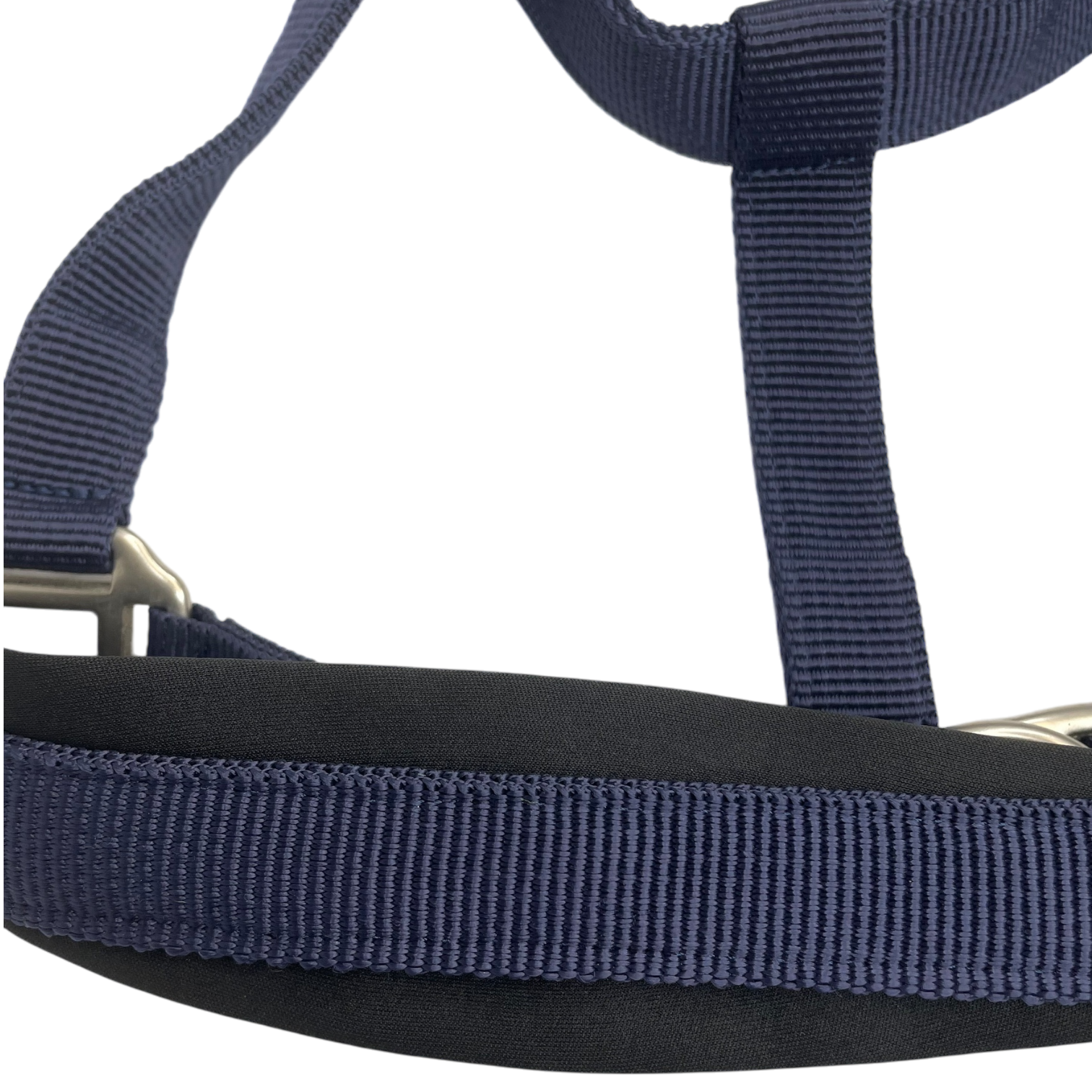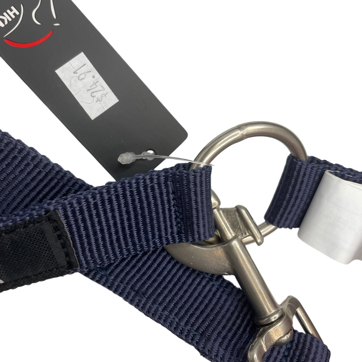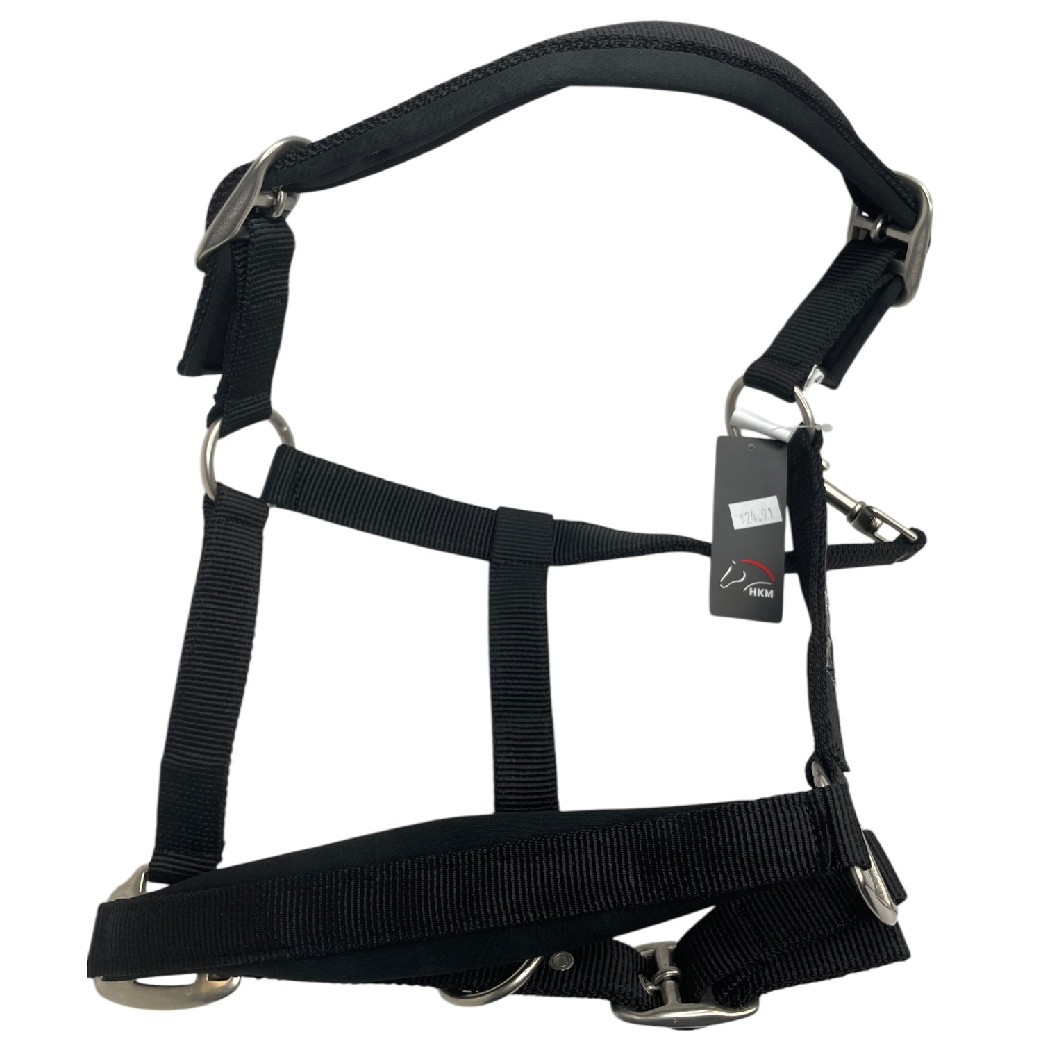 HKM Nylon halter with neoprene padding on crown and noseband. Adjustable on both sides and on throatlatch. Matte silver hardware.