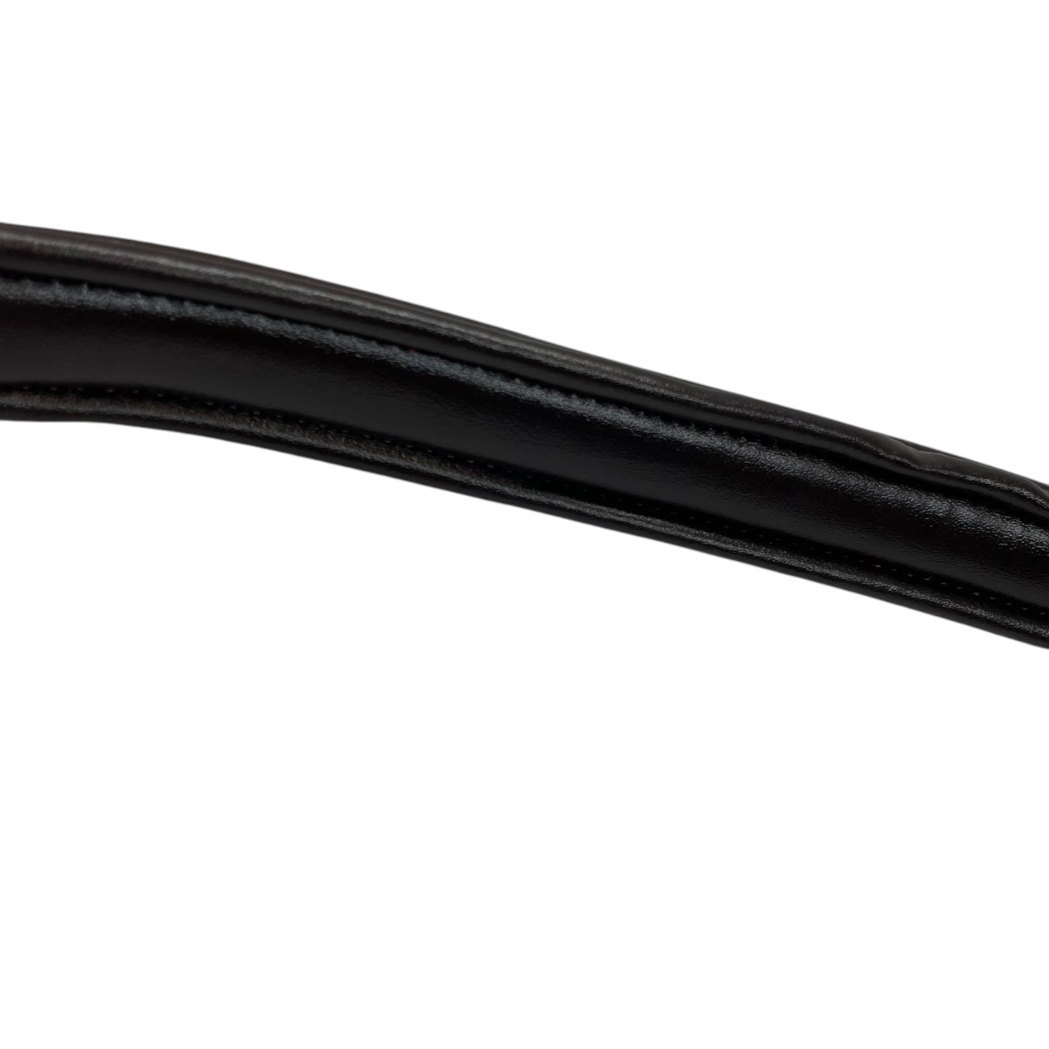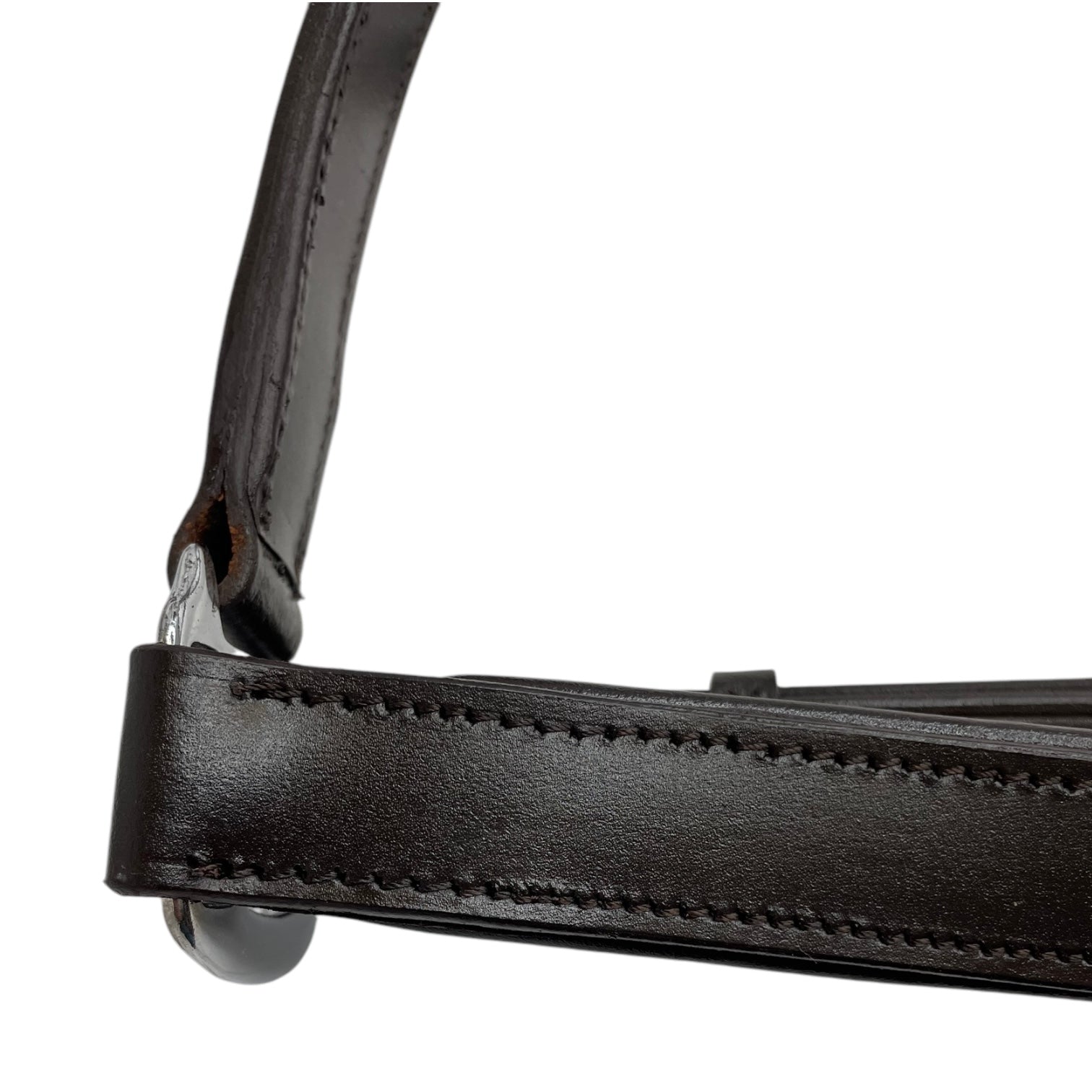 HKM Havanna brown calf leather halter with lightly padded poll and noseband. Adjustable noseband and on both sides. Rolled leather throatlatch, silver hardware, and clip attachment.