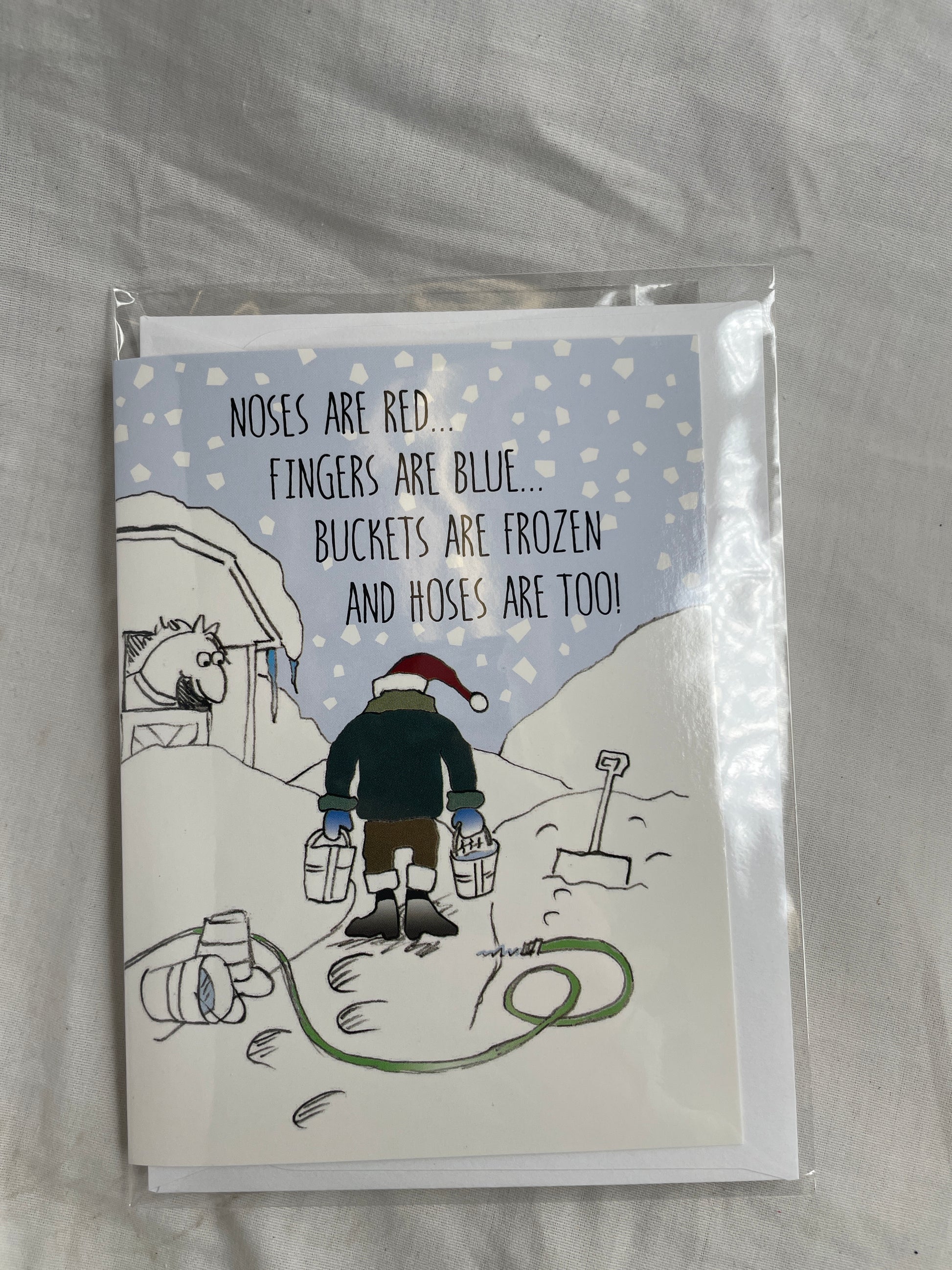 Noses are Red, Fingers are Blue, Buckets are Frozen, and Hoses are too holiday card with envelope. Inside: Wishing you the happiest and warmest of holidays!
