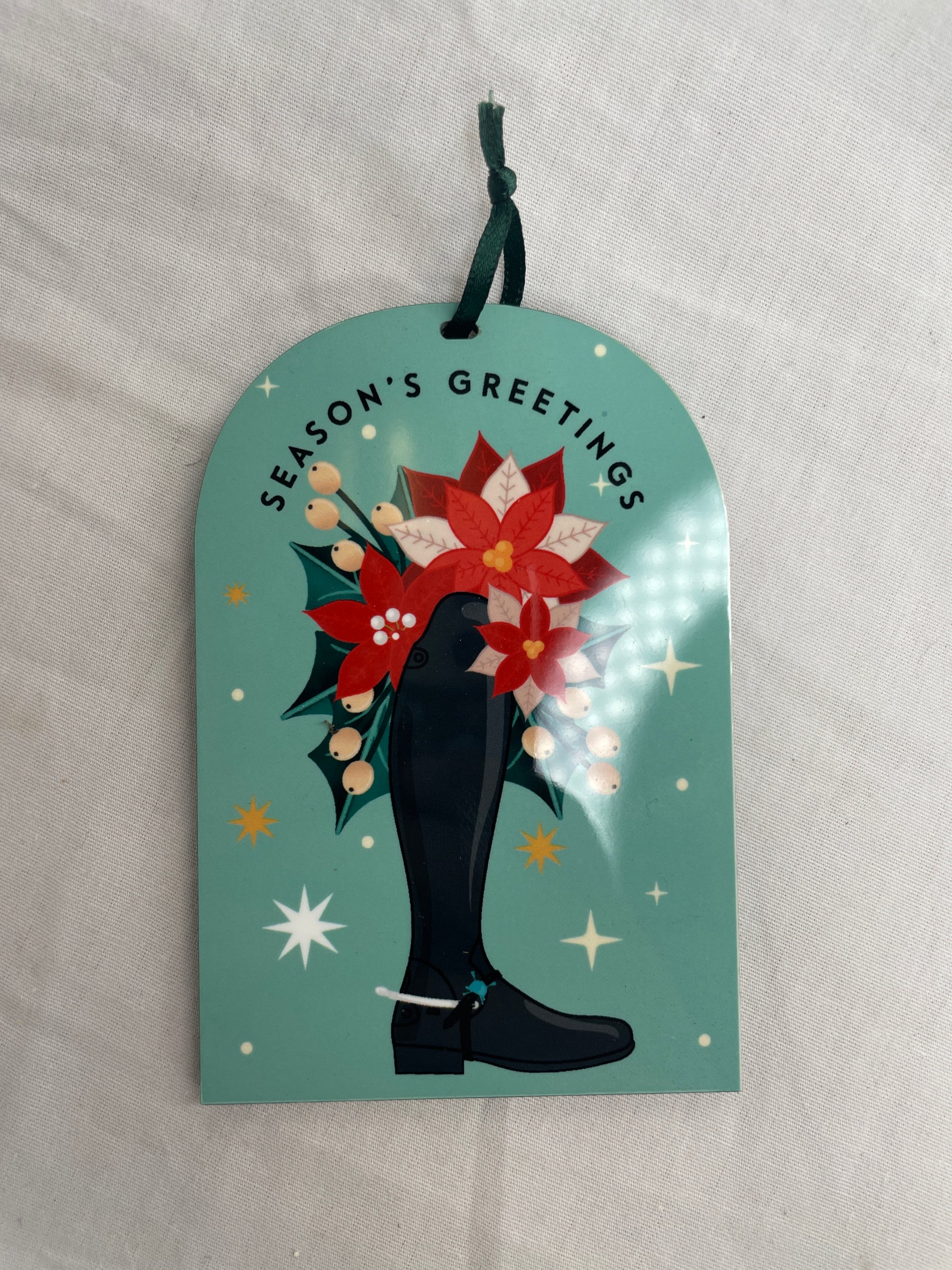 Hunt Seat Paper Company Laser cut ornament with printed horse graphic. Measures 4" tall. Comes with green ribbon to hang it on your tree!