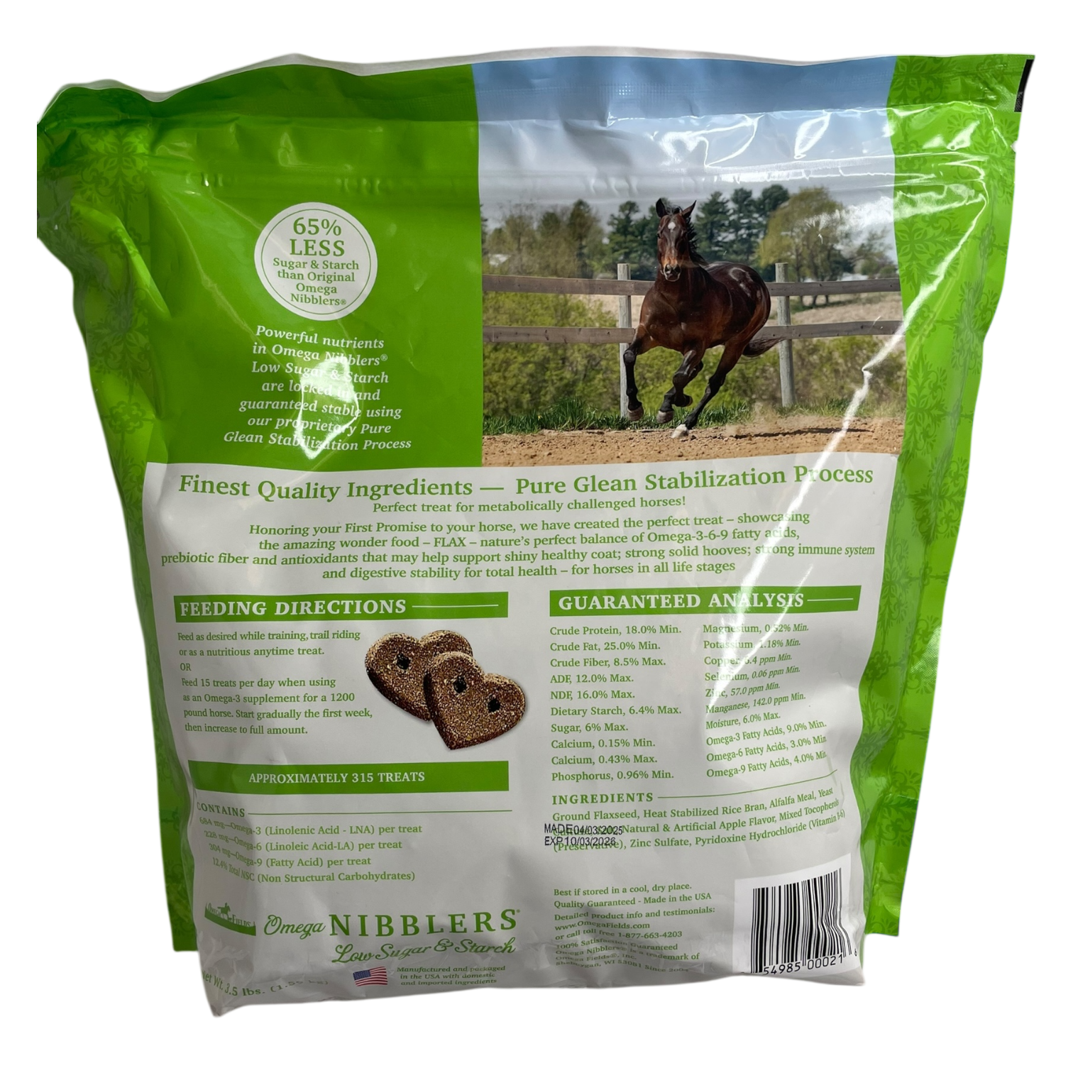Made from stabilized, fortified, ground flaxseed and natural ingredients that taste great - a worthy treat for your horse. Each treat contains 684 mg omega-3, 228 mg omega-6 and 304 mg omega-9.