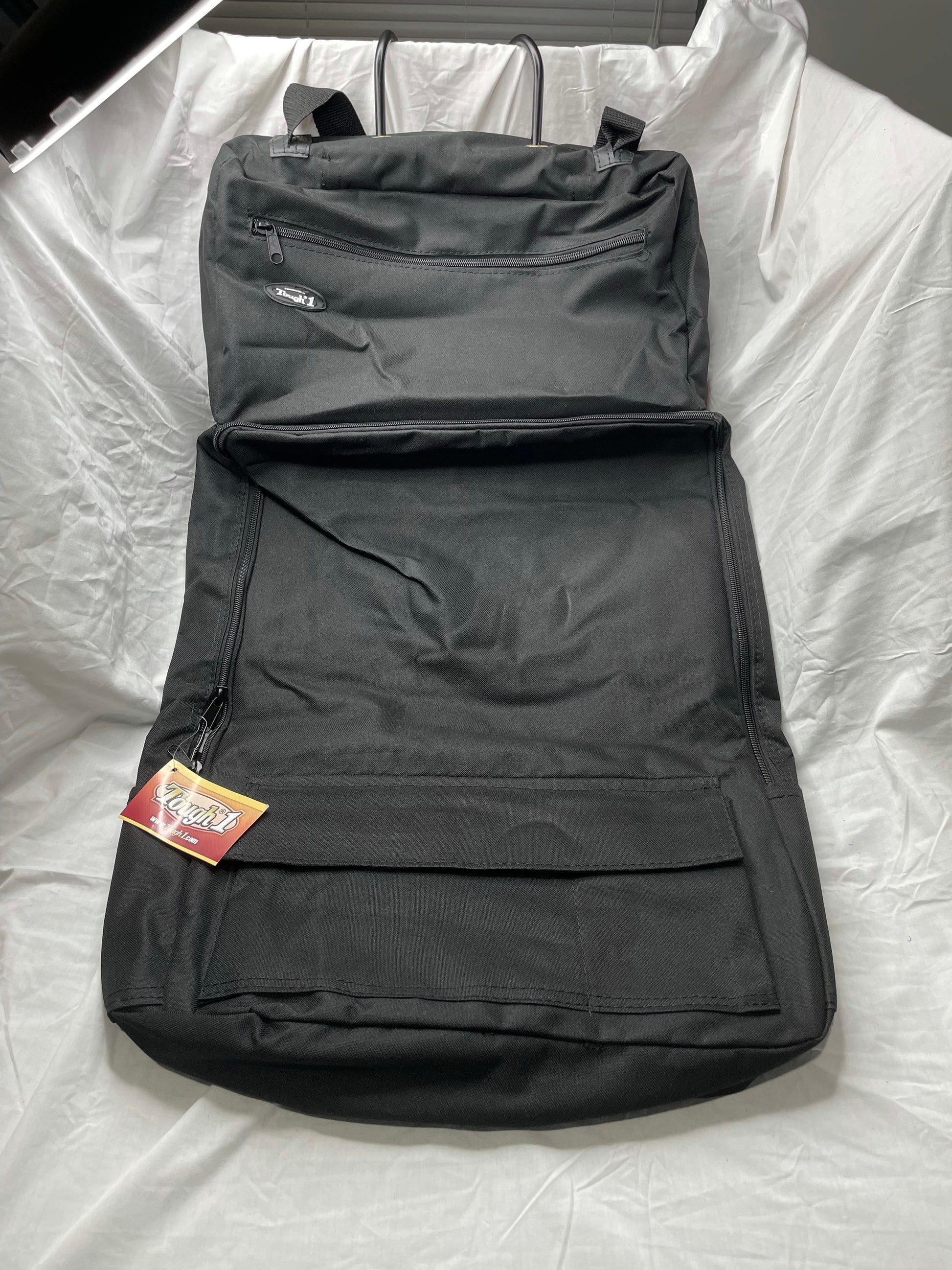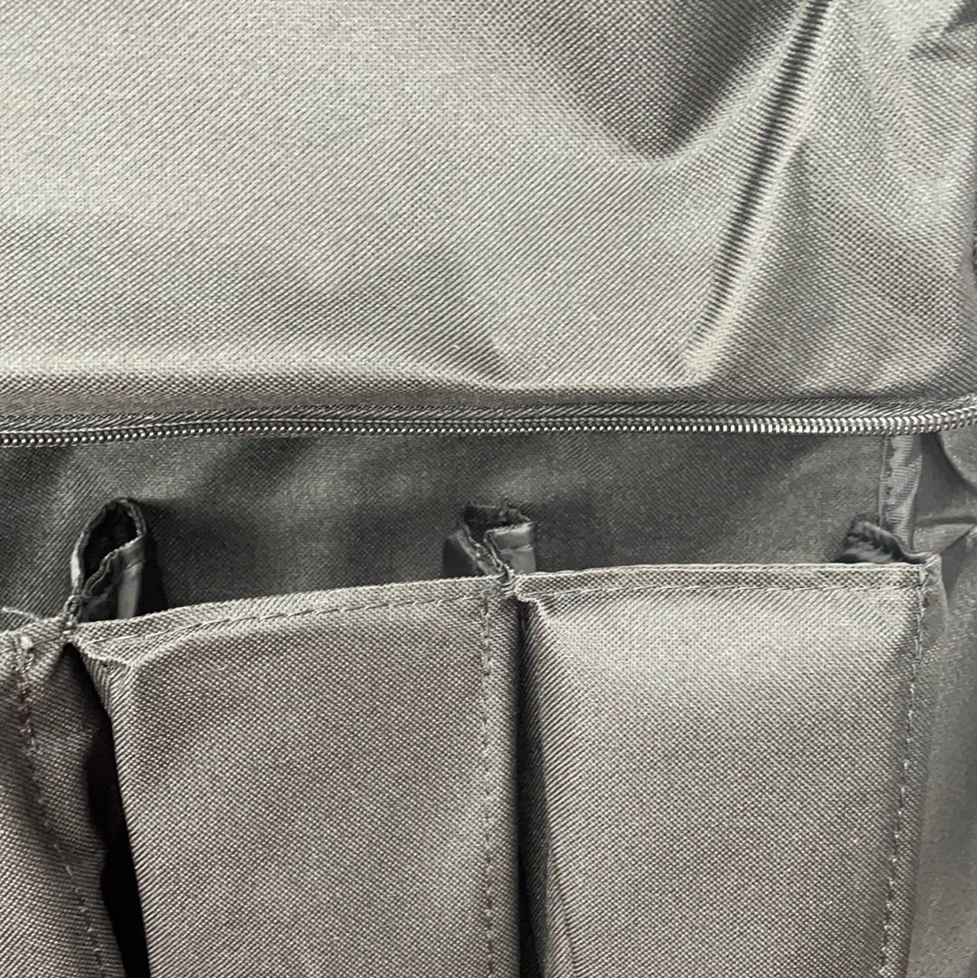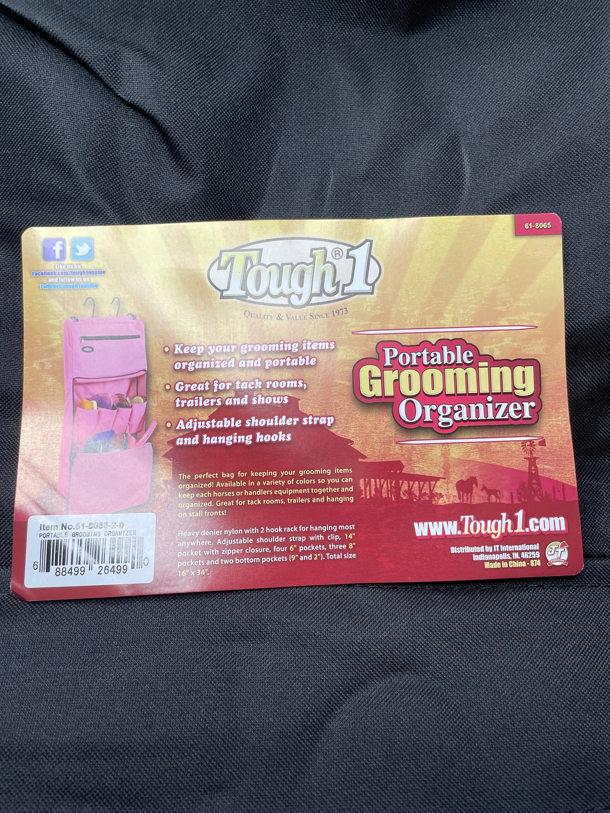Black Heavy Poly/Nylon Grooming Carrier that is ideal for all your grooming needs. Features: Shoulder strap - for ease and comfort when carryiny, Large pocket on front with quick grip closure - great for scissors, braidettes, safety pins, etc. 16" x 9" X 3" Zipper Pocket. Built in Hanger - allows placement on stall fronts and fences. 7 other pockets to hold brushes and bottles