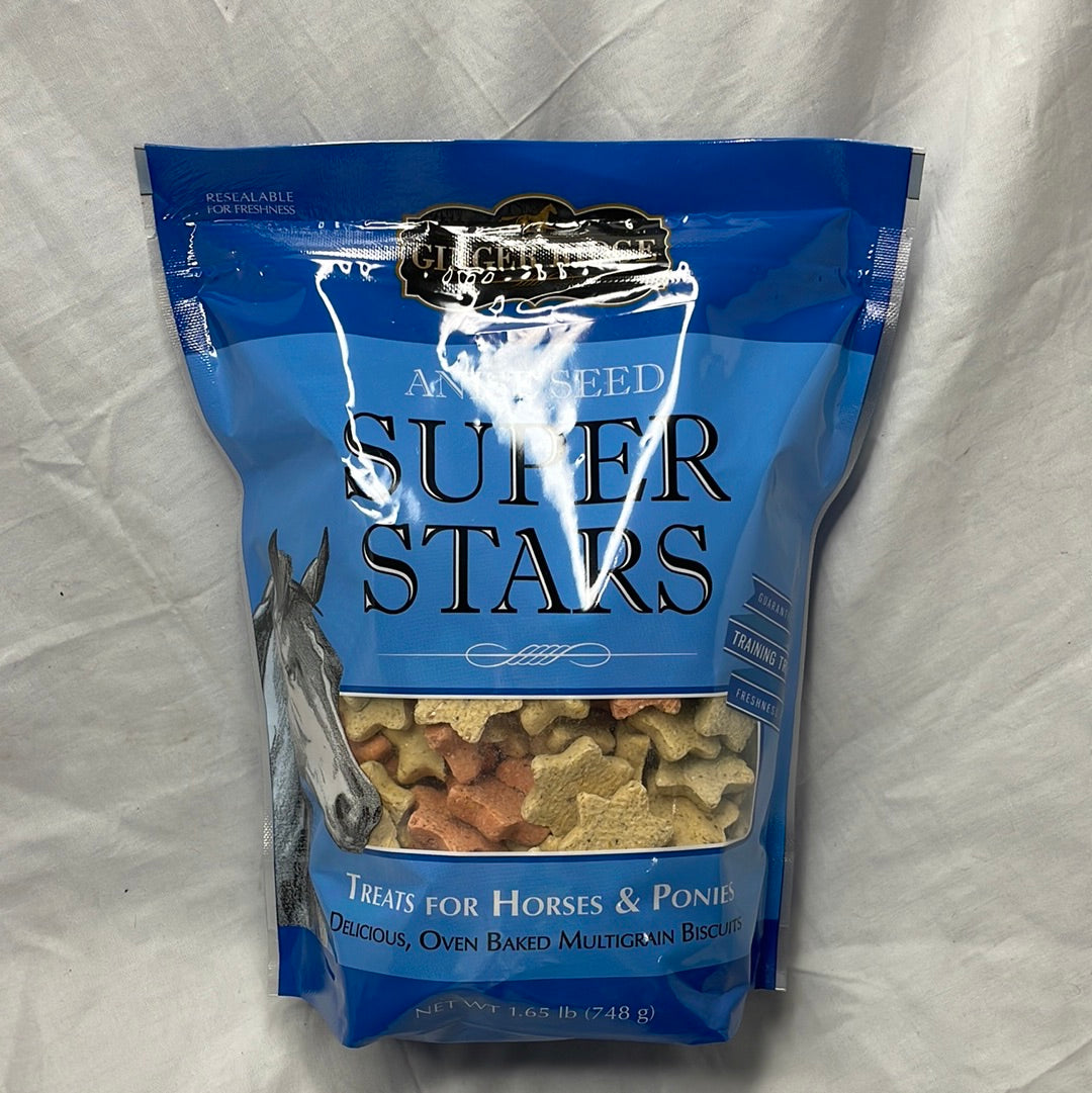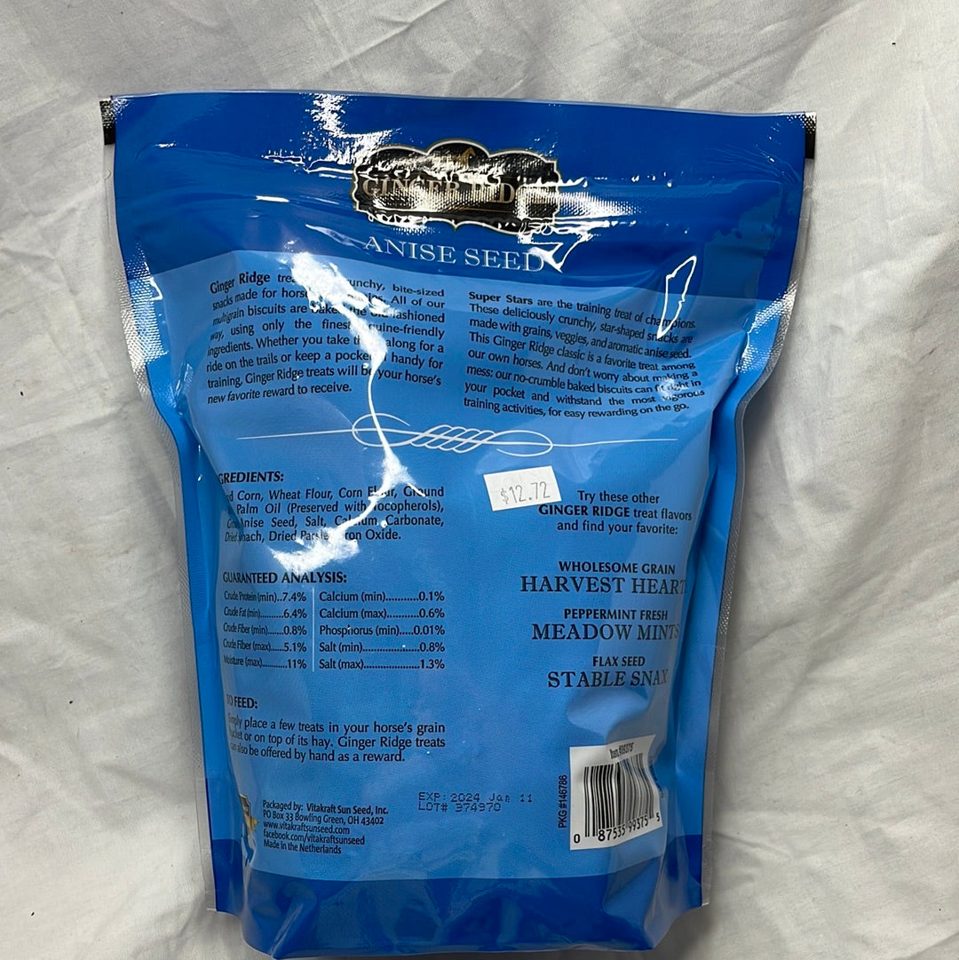 Bite-sized, star-shaped treats contain a blend of delicious natural anise seed and orange oils horses love. Contain min 8.4% crude protein, min 6% crude fat and max 12% crude fiber. Also contain whole wheat flour, wheat germ oil, corn germ meal, beet molasses, vegetable oil, sea salt, anis seed and orange oils.